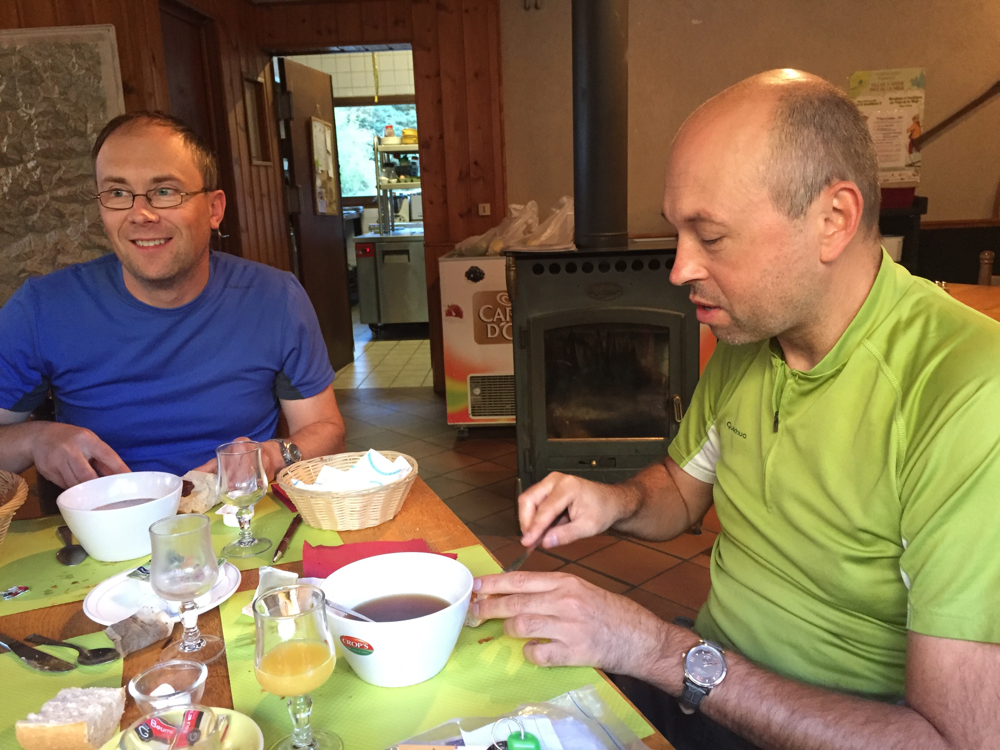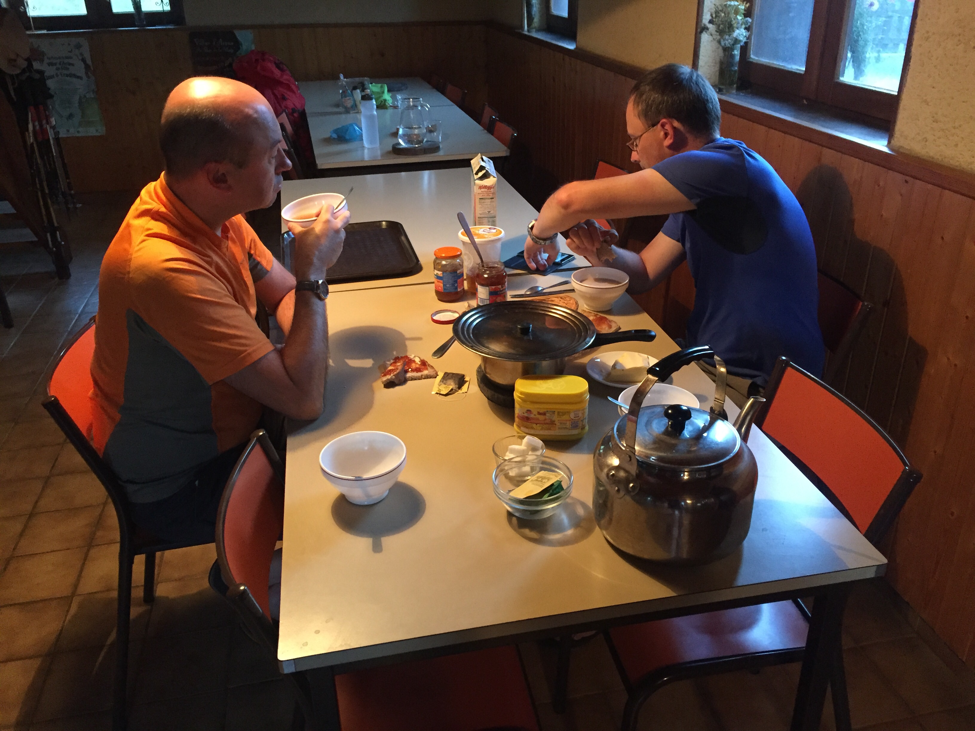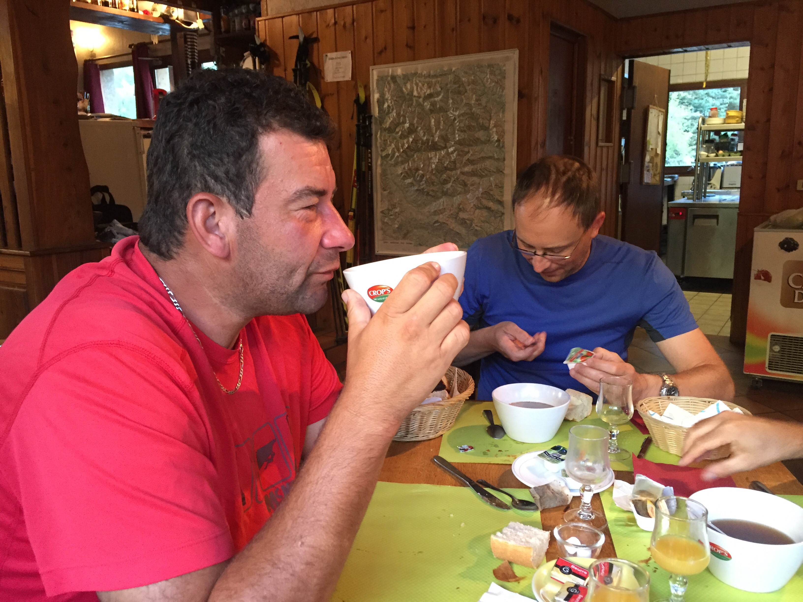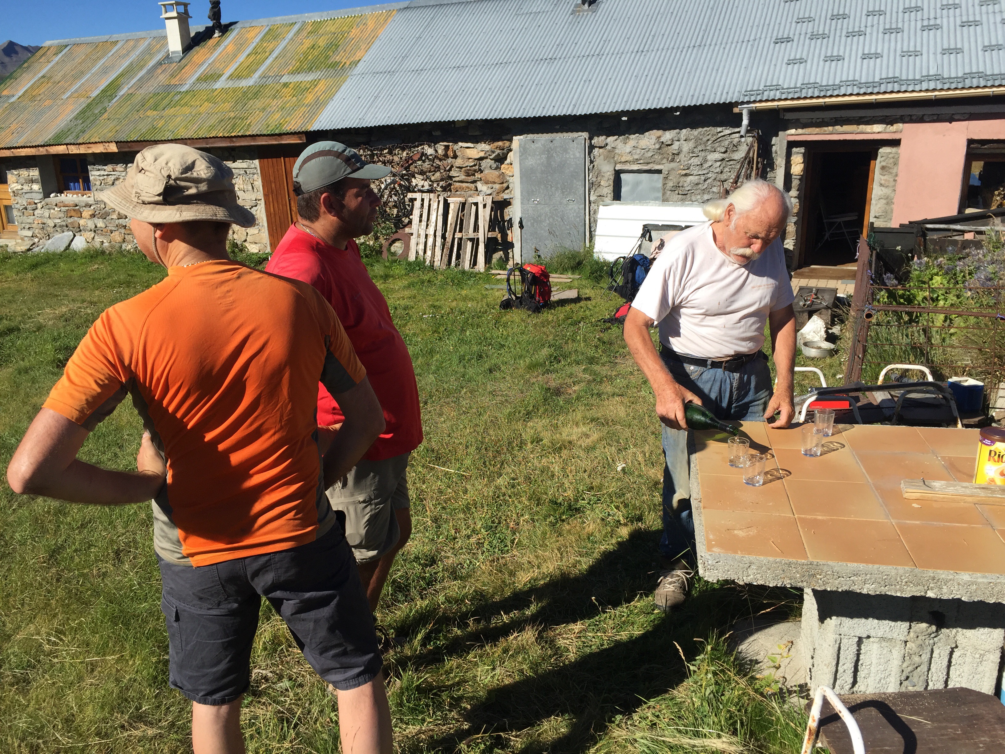 Christian profite par miracle de son panier repas. Il l’avait oublié au gîte. La solidarité des randonneurs a fonctionné. Vincent, notre compagnon de dortoir, l’a récupéré avant de prendre la route du col de la Muzelle.