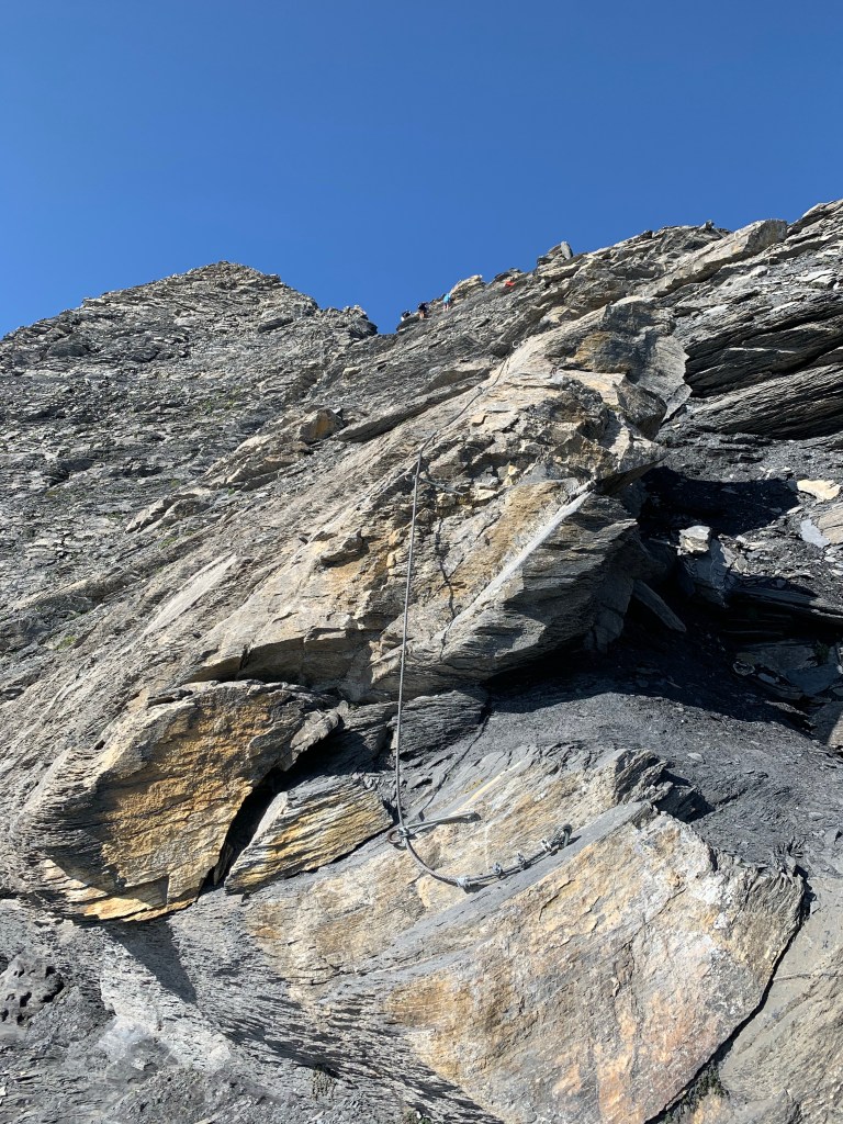 Après un réveil à 04h50, nous sommes partis du refuge du Grenairon (1974 m) à 05h45. Nous étions dans les temps car à 9h30 nous avons atteint le mur de câbles à 2890 m d’altitude.