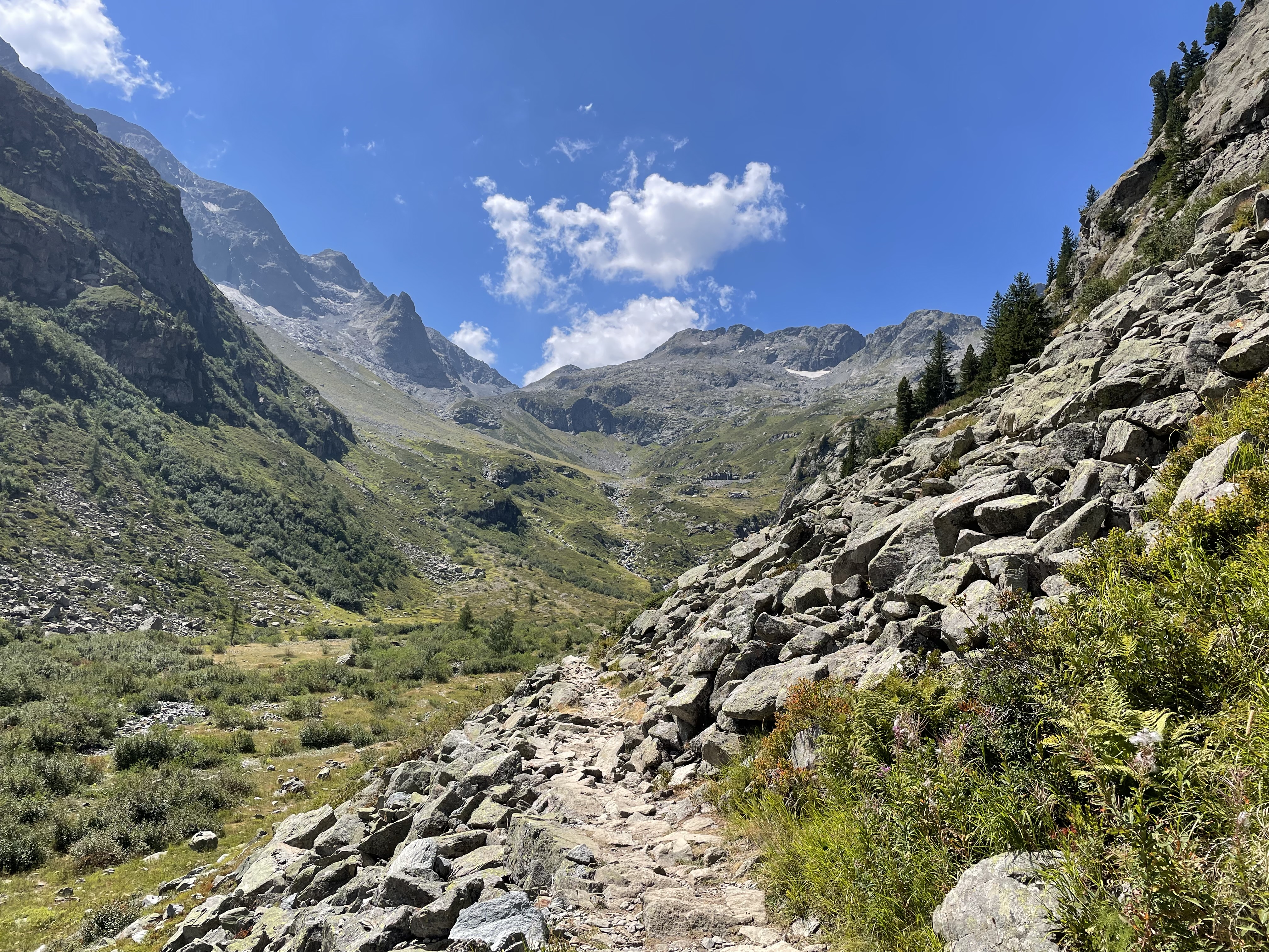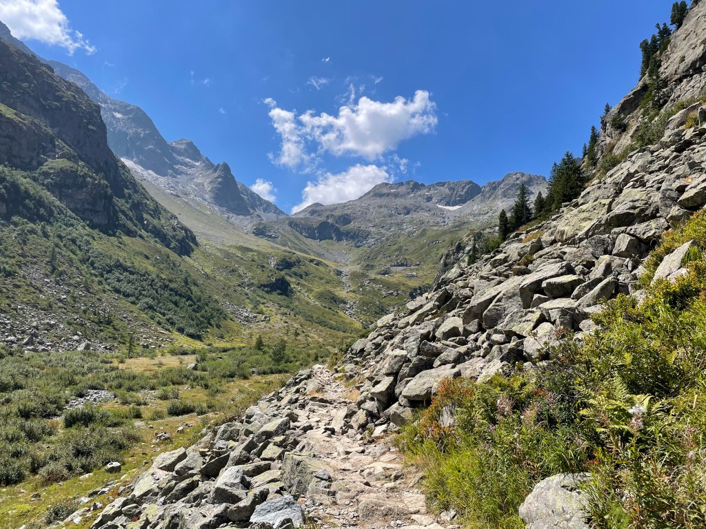 Le col est annoncé en 4h15 d’après les panneaux du parc des Écrins. La montée est abrupte mais assez régulière jusqu’aux éboulis . La phase finale est très abrupte dans du schiste. Le Sentier a été « découpé » dans la roche.