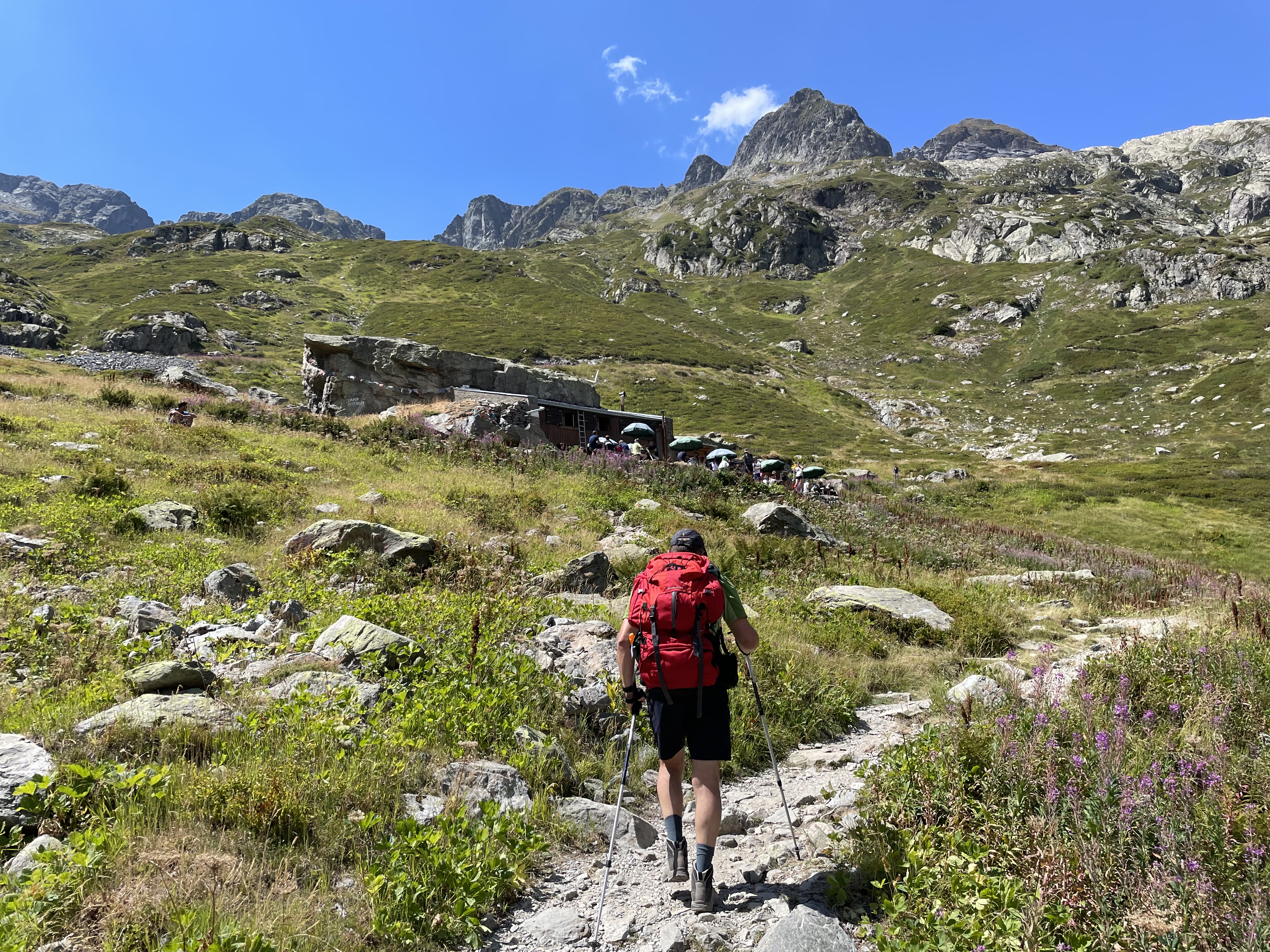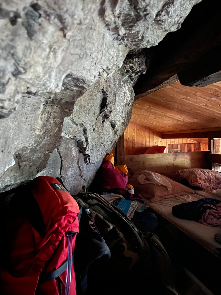 Mercredi 10 août 2022, une mise en jambe de 600 mètres de dénivelé positif jusqu’au refuge de la Pierre à Bérard (alt. 1925 m). C’est un refuge rustique, sans douche et avec très peu d’espace, qui est adossé à un énorme rocher. La roche est notamment visible depuis la salle de couchage.