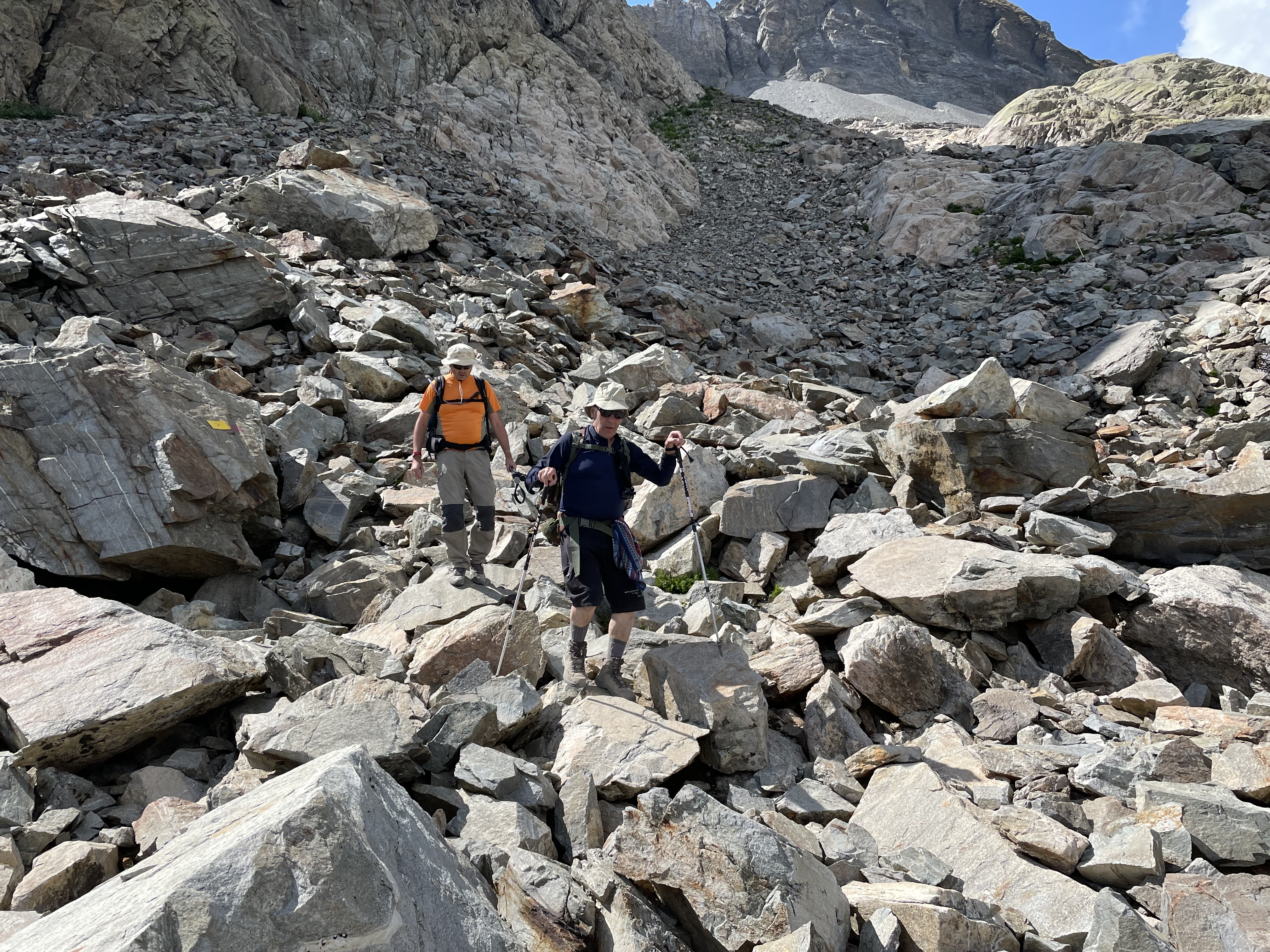 À 07h05, chaussures sèches au pied, Cyril et Christian partent à l’assaut du premier col : le Col de la Muzelle (2613 m). Ce col ressemble à un mur de pierre du fond de la vallée.