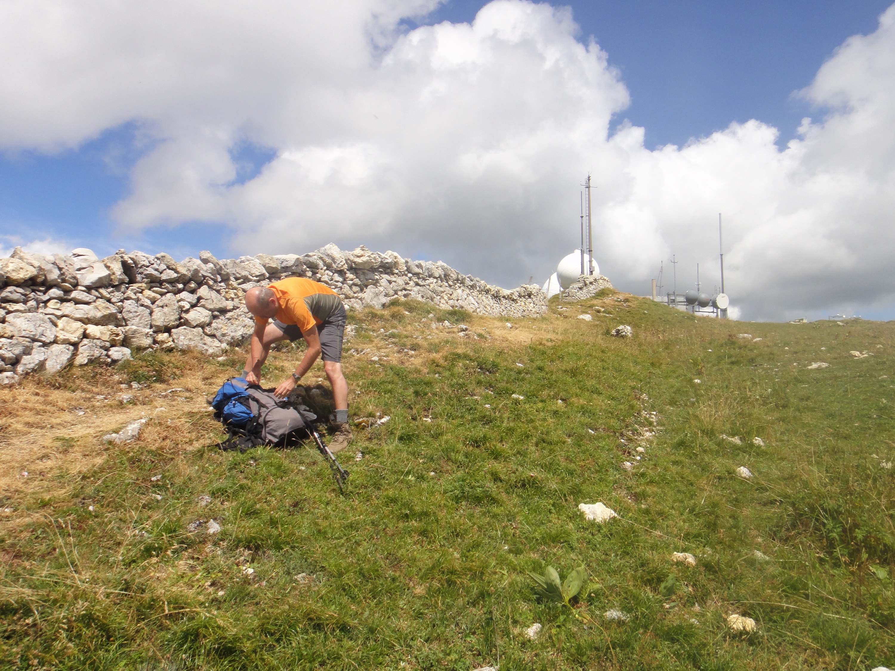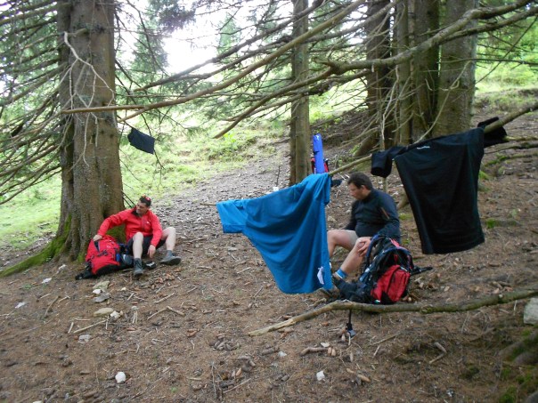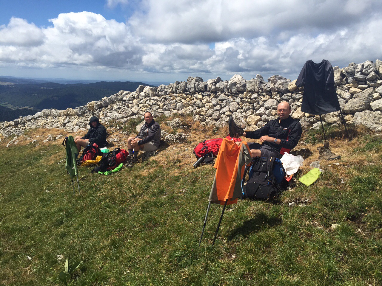 Arrivée au sommet, nous avons pris notre déjeuner. Au menu, sandwich de saucisson, de jambon sec, de fromage, chips, barre de céréales et banane. La pause a fait beaucoup de bien, surtout au pied. Et pendant le déjeuner, les tee-shirts prenaient l’air…..