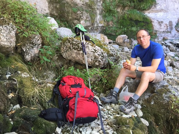 Nous faisons notre pause déjeuner à la fin de la descente. Au repas, salade de pâtes, de rôti de porc et olives vertes (cf. dîner de la veille) avec chips, fromage, barre céréales et une pomme. Un repas très frais!