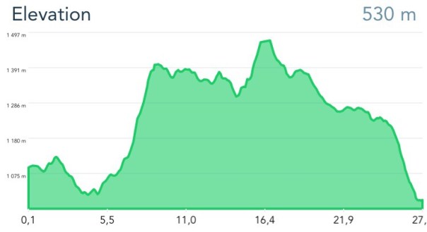 La randonnée du jour se traduit par les chiffres suivants : 27,5 km avec un dénivelé positif de 686 m et négatif de 1210 m. Le temps de marche effectif hors pause est de 6h50mn