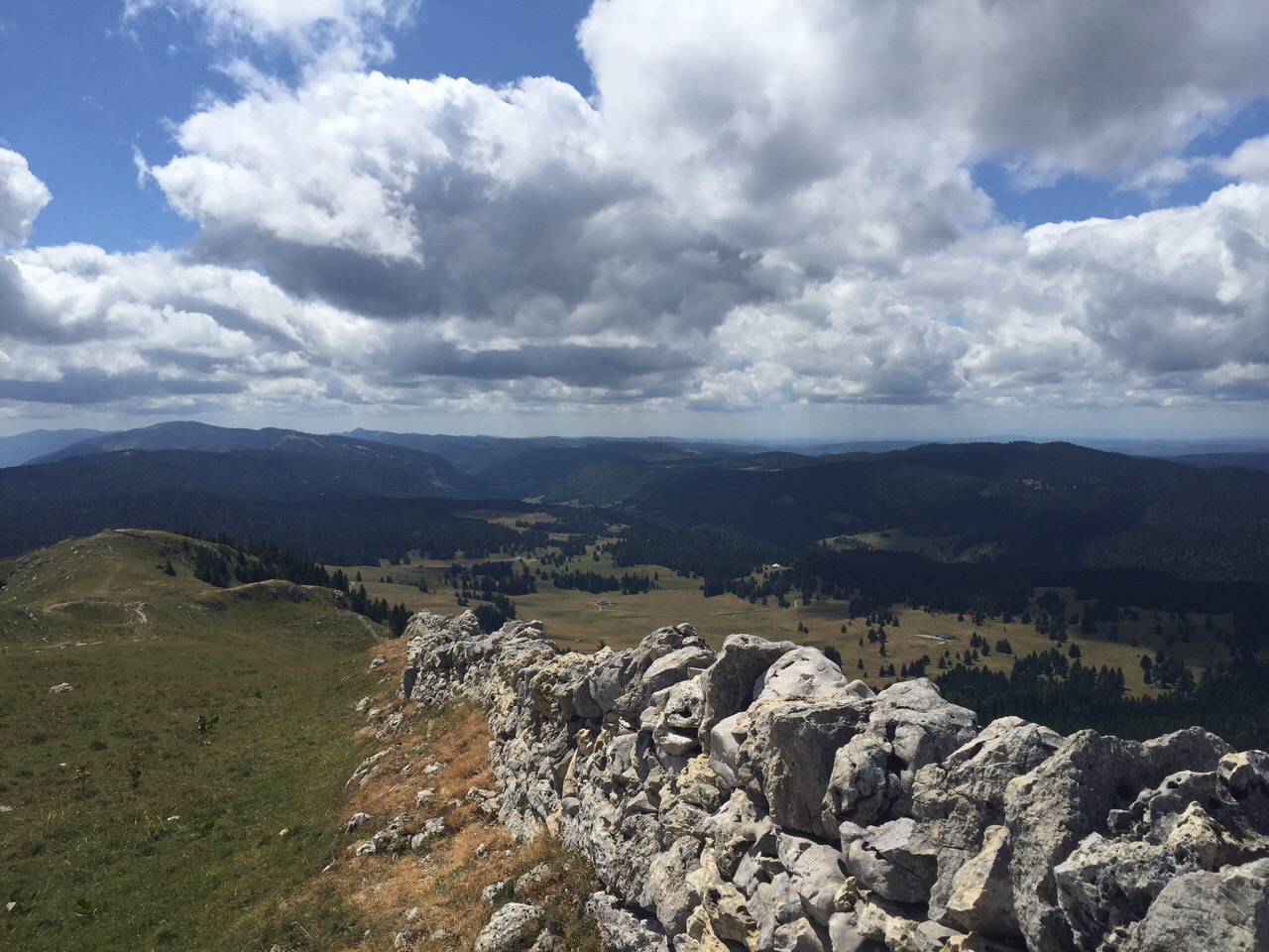 Après un passage frontière le long d’une route de montagne perdue (sans douanier suisse🇨🇭 ou français🇫🇷 😉) , nous avons atteint la Dole vers 13h30. Un fort vent glacial soufflait au sommet. Nous avons été obligés de nous abriter derrière un mur en pierre sèche et enfiler les coupe-vents ou les polaires.