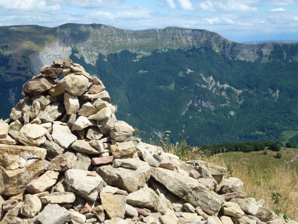 Nous avons ensuite pris le GR pour rejoindre le Reculet. C’est un sommet surplombé par une croix en fer datant du 19ème siècle. En arrivant sur place, nous avons regretté de ne pas avoir réservé une table! Il y avait une bonne trentaine de randonneurs qui déjeunaient entre famille et amis… avec du vin….
