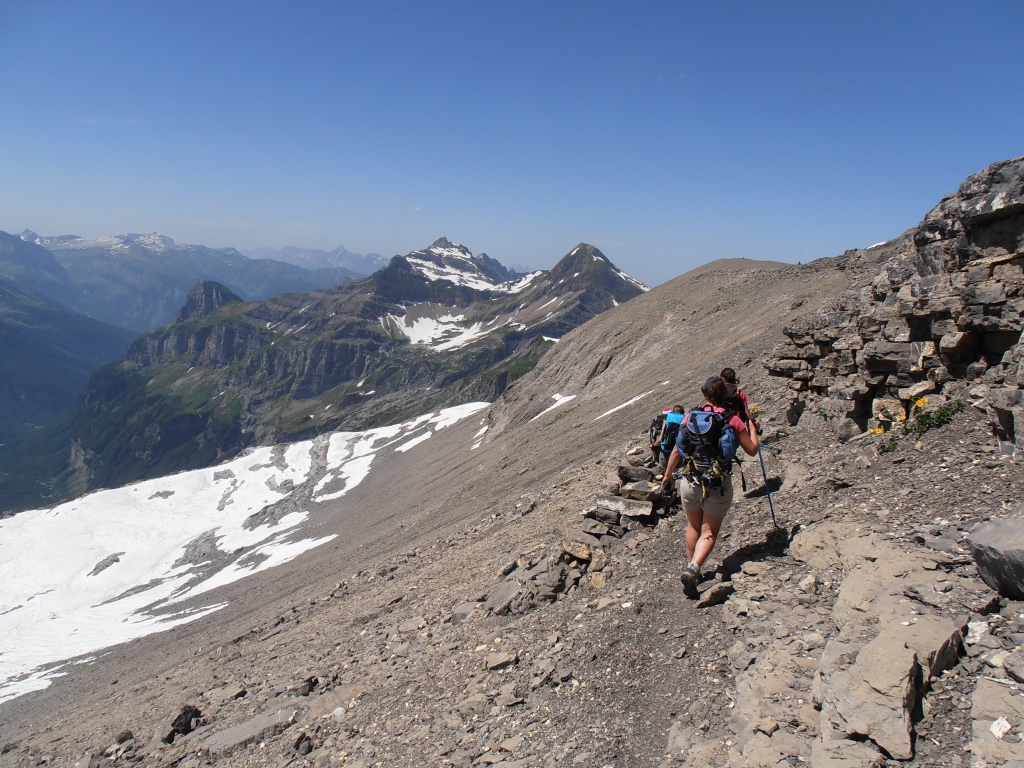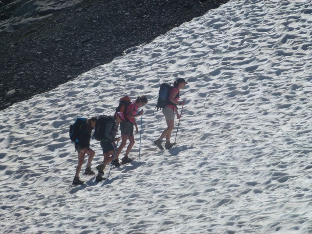 Durant la soirée au refuge, nous avons fait la connaissance de 4 jeunes randonneuses qui doivent également passer le col. Ceci va nous permettre de réaliser l’ascension avec d’autres personnes (dont certaines très à l’aise sur les névés)