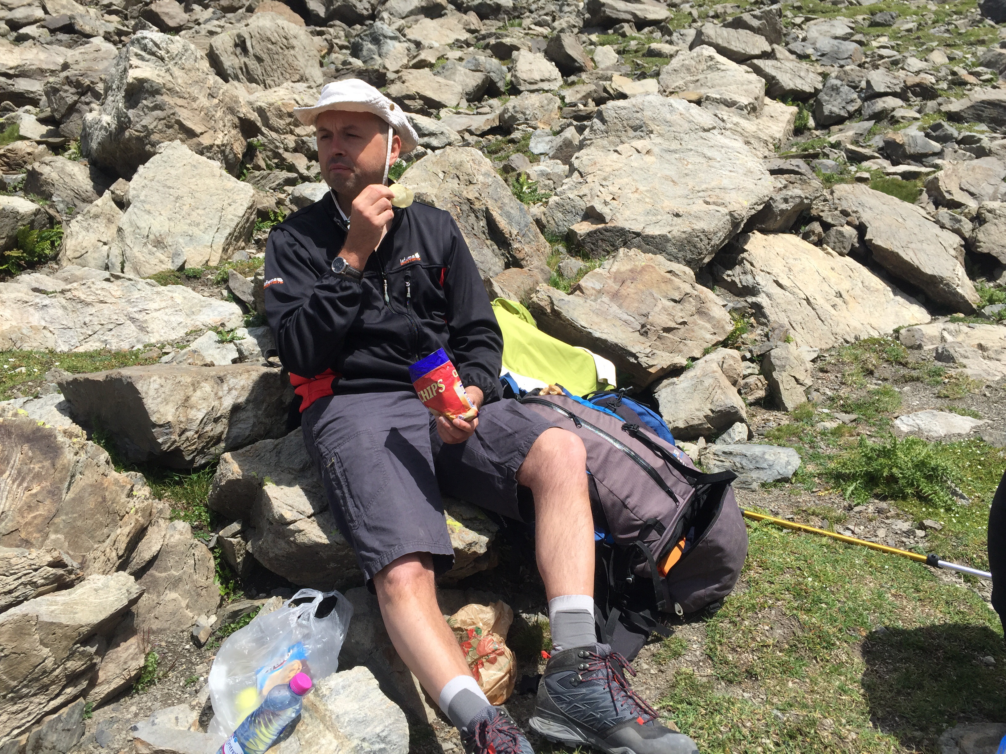 Nous avons pris notre repas à 12h45 dans la longue descente vers le refuge du Pré de la Chaumette (chips, jambon sec et tomme en sandwich + fruit et des biscuits au chocolat offerts par Olivier)